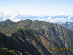 | 赤石岳を登る途中、右前方に縦走路がよく見える。 左から、兎岳、中盛丸山、大沢岳と続いている。 聖岳は兎の左に位置するが赤石に隠れて見えない。 |