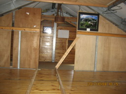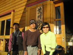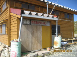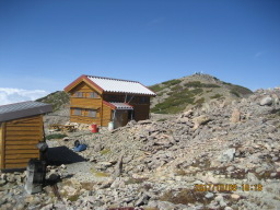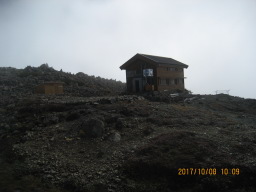 | 赤石頂上のすぐ傍に赤石避難小屋があった。 雨の場合一度検討し、宿泊を考えた小屋である が、思ったより大きな小屋であった。この小屋は 夏なんかに泊まって夜空をみたり、日の出なんか きれいなんだろうなと思う。一度泊まってみたい小屋 である。この日から閉鎖するということである。泊まり たい人は、階段をあがり2階から入れるようになって いる。 |