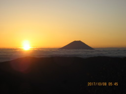 | 17.10.07 10.05.-06と2日間、雨続きで満足のいく山行では なかったのであるが、3日の天気はド快晴であった。 左記は荒川小屋から見た富士山の日の出である。ほん とうに素晴らしい眺めであった。6日の宿泊客は8人程 度で、話によると千枚小屋は130名で満杯とのこと。 昨日の千枚での4人宿泊とは雲泥の差である。連休の スタ-トということがあったのだろう。 |