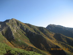 | 昨日歩いた、千枚岳、東岳、中岳、前岳が快晴も もと眺めがよい。 |
