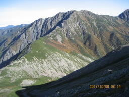 | 8:00 小休止 前岳、中岳が大きく見える。近くから見たときは そんなに大きく雄大に感じなかったのあるが。 奥に控えているのが悪沢岳。 |