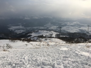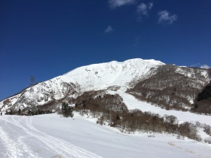 | 9:20 休憩 3合目から直登のル-トがついていて 安心といえば安心だが、登る前から 気がかりであった雪崩はほとんど起き ないという場合はいいが、間違えば 雪崩の危険のあるル-トであるという ことを肝に銘じておくべきだろう。 この天気と今の雪の量では大丈夫 だが、これから20-30降ったあとの このル-トは絶対さけなければなら ない。どうしても9合目を目指すなら 南側のピ-クに向かって右側にシフト しながら、9合目を目指すべきだろう。 |
