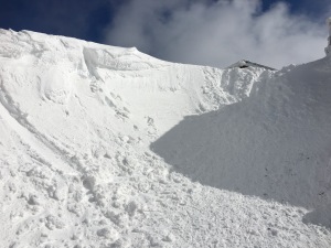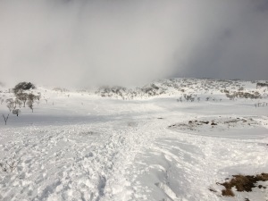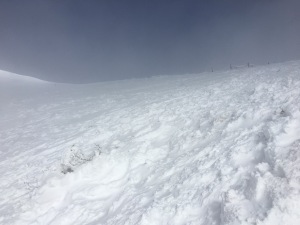 | 下山途中、雪崩後を発見する。 朝の登りでは、ガスがかかって いたので気付かなかったが、 明らかに左記写真は雪崩のあと。 場所は9合目が下りたところで、 8合目までは降りていない。 とにかく、この場所は要注意と いうことである。 11:00 避難小屋へ着。 11:30 小屋出発。 |