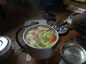 | ポトフ料理が完成に近づいたころ。 下から、500cc2本担ぎ上げ、乾杯 する。焼酎、ウィスキ-などで食が すすみ腹いっぱいになってしまった。 |