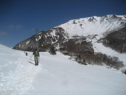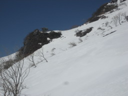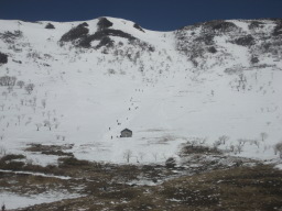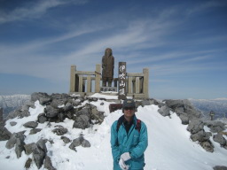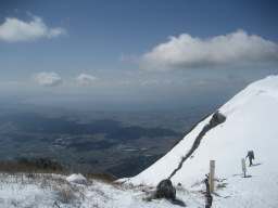 | 頂上は風の関係だろうか、積雪の 多いところと少ないところが顕著で あった。頂上には結局1時間も長居 することになった。2時に出発し、2: 30分に5合目、2:50に3合目、3: 20に1合目まで下山した。1合目で テント張っていた青年がいたが、今 日で4日という、あと1週間ぐらいここ にいたいという。なんとものんきな話 若い時はいろいろ経験すればいい。 3:40に登山口まで降りた。いい山行 であった。感謝 |