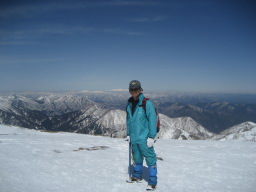 | 頂上をバックにおさまる。 ドライブウエ−が開通する前に 登りで避難小屋で泊まり、翌日頂上 に登り、17KMある車道を下山で使 ってみたいが、・・。近い山をどう親し みながら付き合っていくか、いろいろ な楽しみかたがあるように感じる。 |