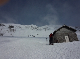 11:10 出発。歩いているとガスが晴れ快晴。 11:35 5合目 11:55 小屋。左がその避難小屋。そこから頂上 を見ると直登の足跡トレ−スが付いている。 この時期に誕生日を境に伊吹に登るが真っ すぐなトレ−スはあまりなかったのではないか いつも蛇行ぎみにル−トがついていたように 思う。雪は正月以来降っていないとの話であっ たが、昨年より雪が少ないという印象であった。 斜面は7、8合目から9合目付近が急である。 このあと雪が50cmぐらい降ったら表層なだれ が起きそうな状態になるだろう。 |