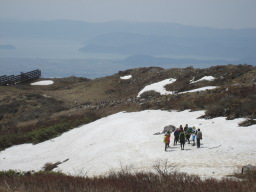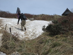 | 11:45 9合目通過。 左写真は、9合目から頂上へ向かう 途中の写真。 頂上には、雪が残っている。 11:55 頂上へ到着する。 スタ−トして、3時間20分かかったこと になる。ノンストップでゆっくり歩いたこと もあるが、速く登らなくても、ゆっくり歩いて 止まらなければ意外と速く着くことの証明で ある。 |
