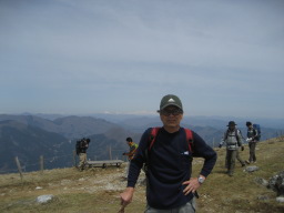 頂上で、白山をバックに撮った写真。頂上からは 御岳、乗鞍、穂高連峰がくっきり見えた。6,7年前 の快晴の1月に見た山には比べようがないが、かな り遠くまですっきり見晴らせた。 |
