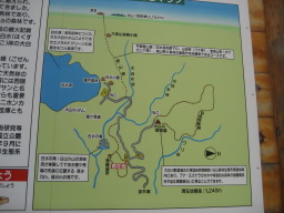 | ほぼ、大白川に近いところに看板。白水の滝の 説明と3000年前の大噴火でどう溶岩が流れた かなど書いてある。大倉山の北側の大白水谷を 流れ、大白川湖をせき止めた。 |