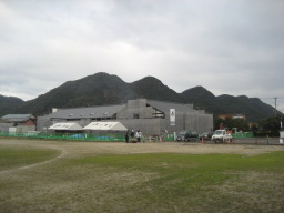 | 10.01.01故郷の情景。60年代から 住んでいた家の前、元大川中学校の校 舎が今度は大川公民館になる。まだ工事 中だが、4月には完成の予定。 |
