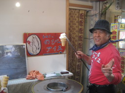 | おかげ横丁の神宮入り口にイスが3席 ある肉、ケ−キなど売っているところが あった。そこで食事を取る。そこに、50 代前半の店主?がいてノビ−ルアイス クリ−ムを売っていた。おもしろい主人で 数年前に病気で倒れて半身不随になっ たことなど話だした。「健康一番」としみ じみ言っていた。ビ−ル2本、シカ肉など 食べていいひと時であった。彼はこの時 間に、「ことばは光」辻慶樹の写真集をみ せてくれた。30分がいい時間であった。 |